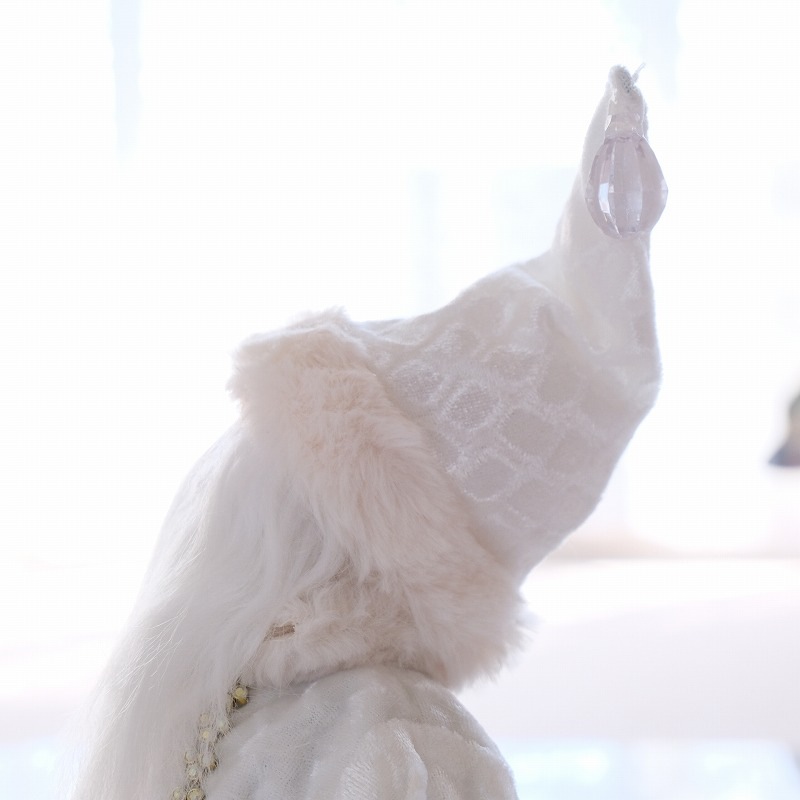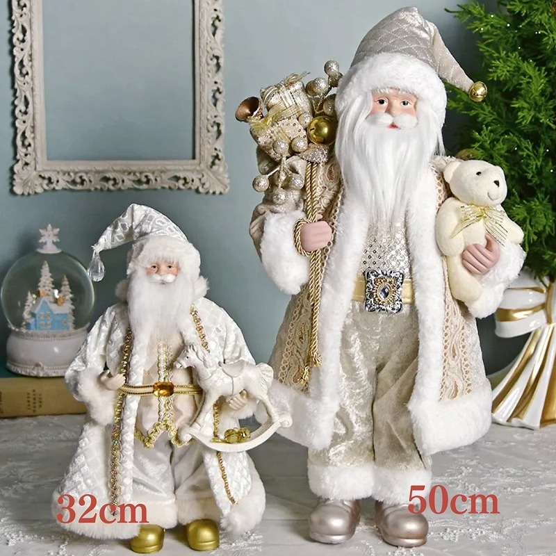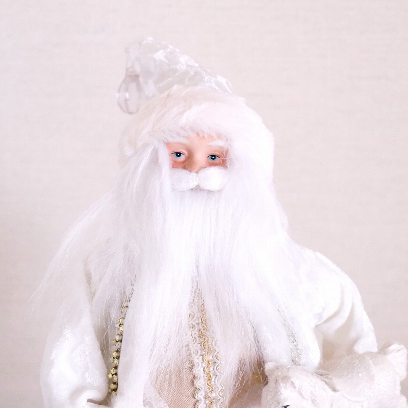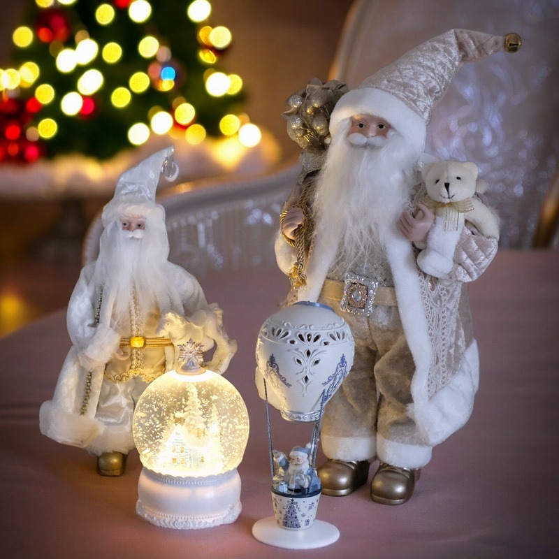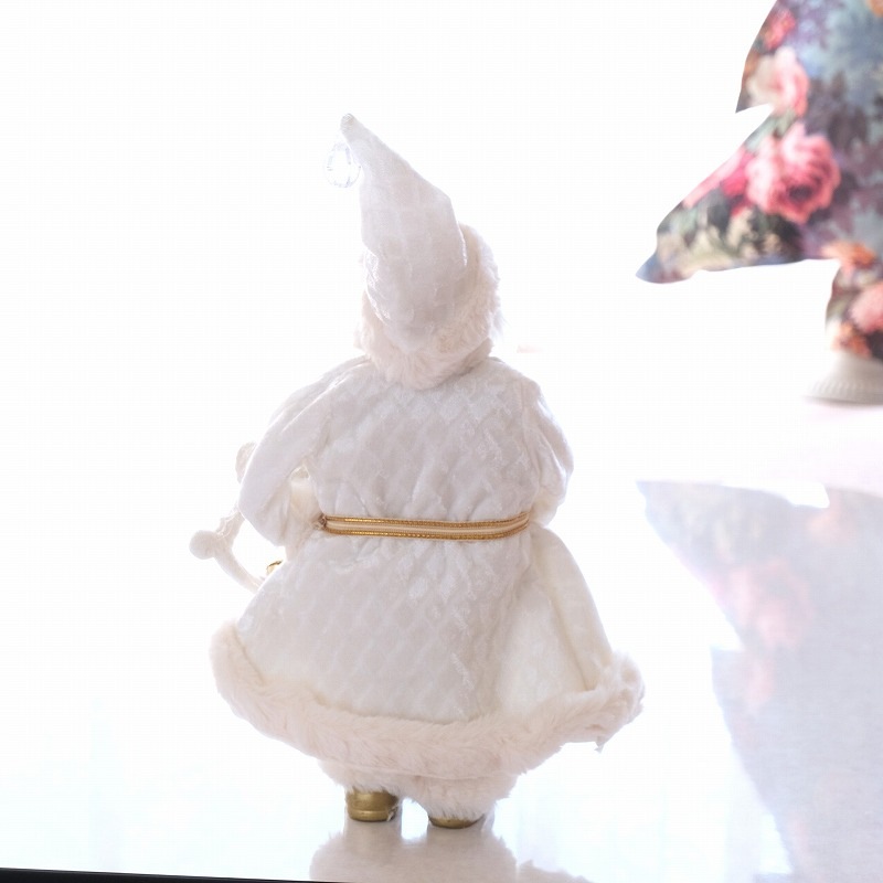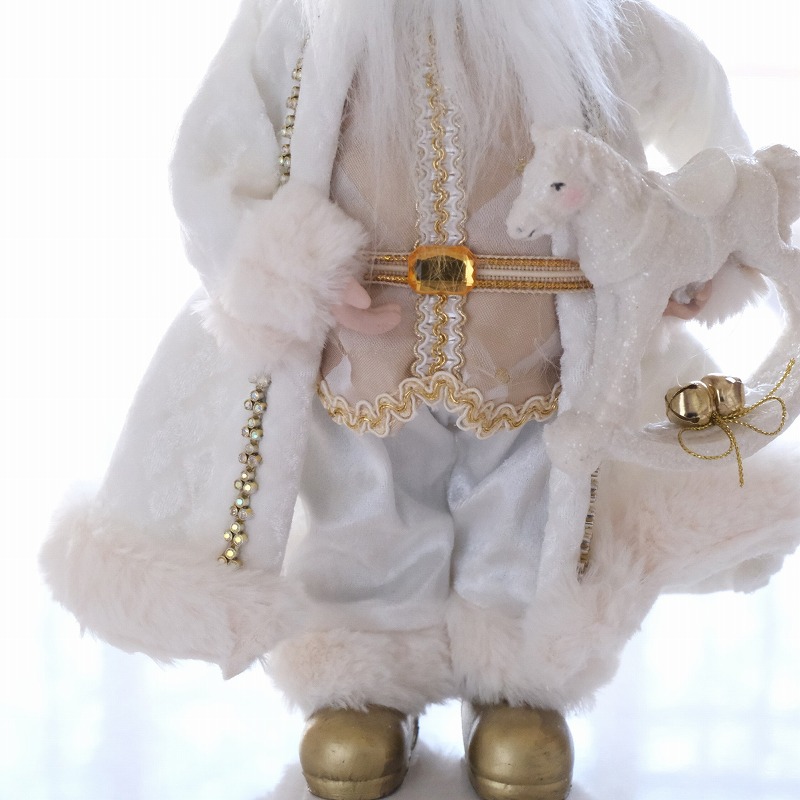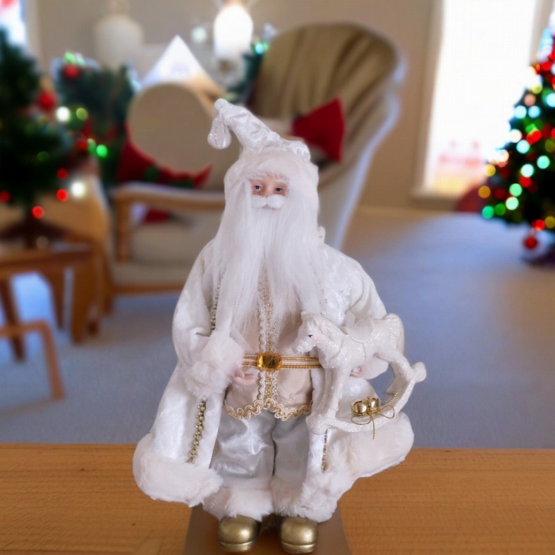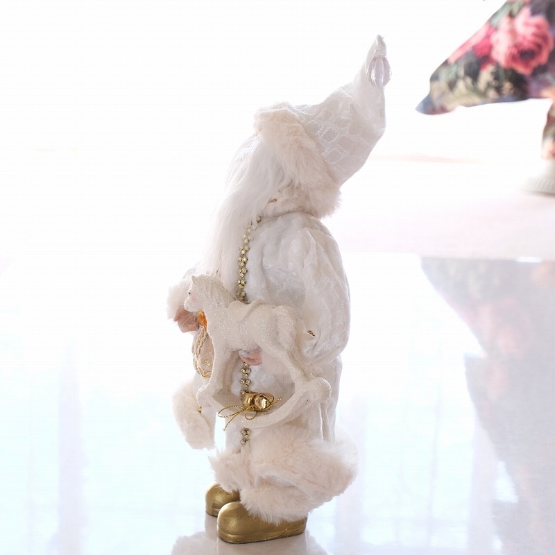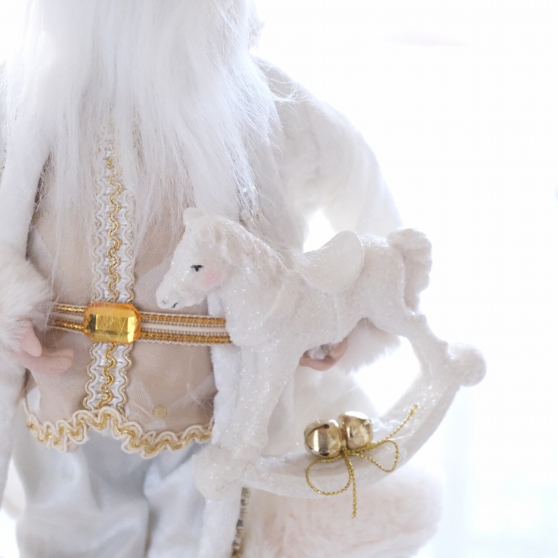 クリスマスの魔法をお届けするサンタクロースフィギュア。ホワイト系のエレガントな衣装を着た愛らしいサンタが手に持つロッキングホースは、心温まる雰囲気を醸し出します。