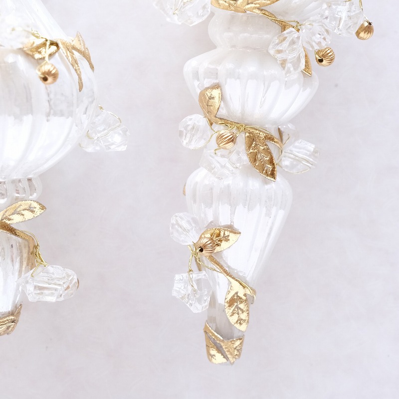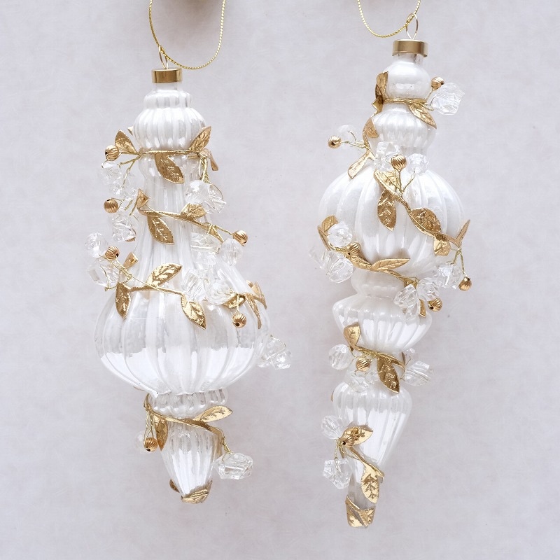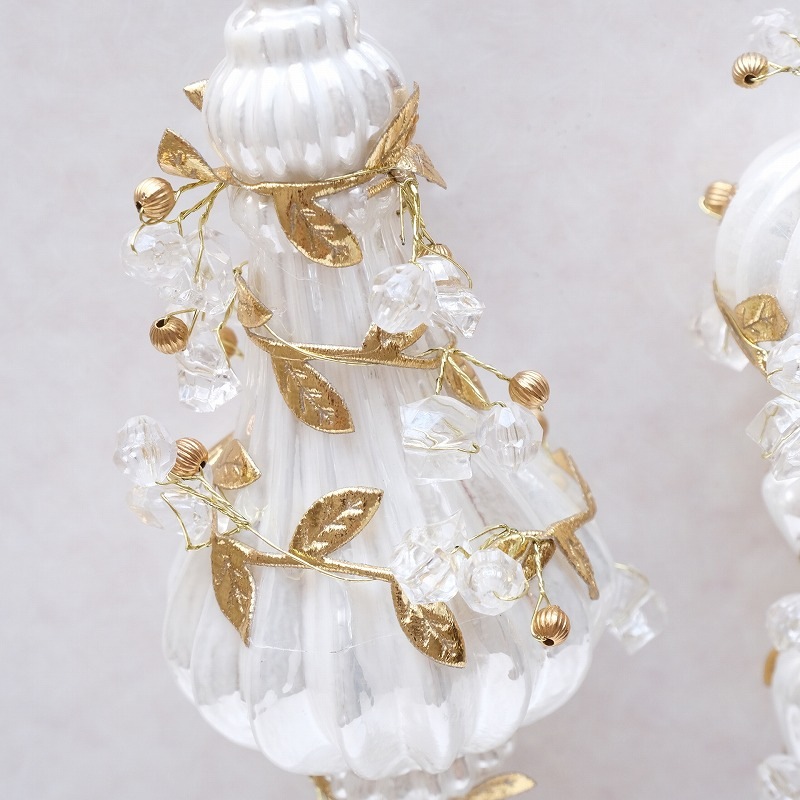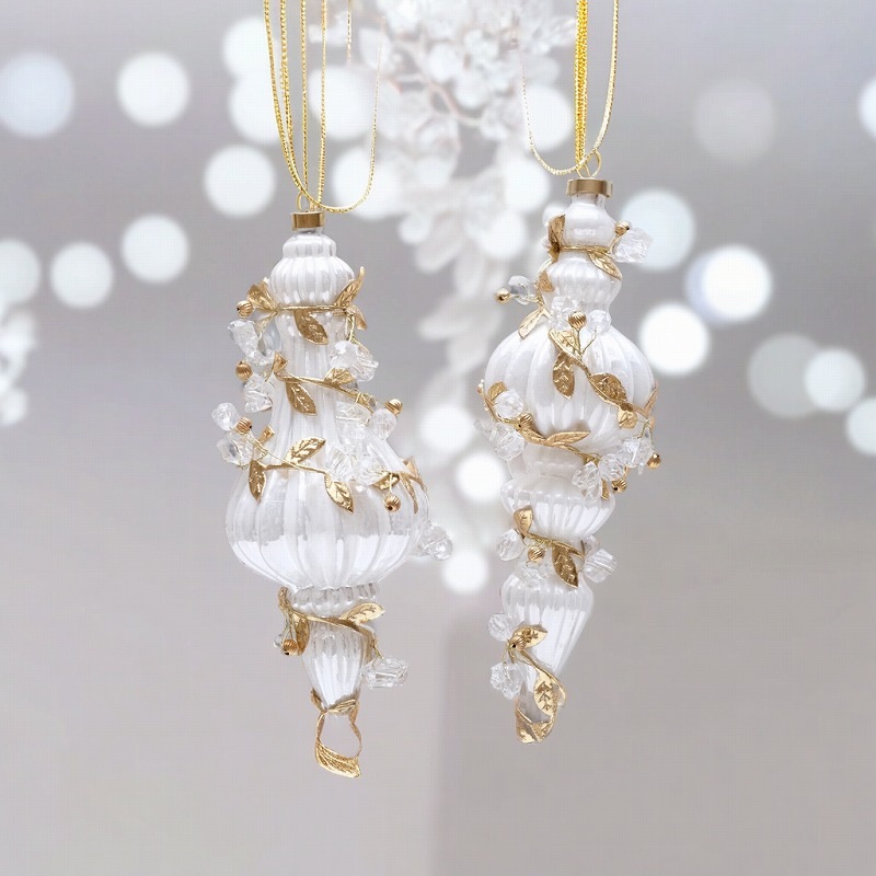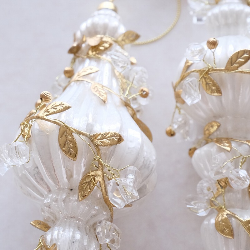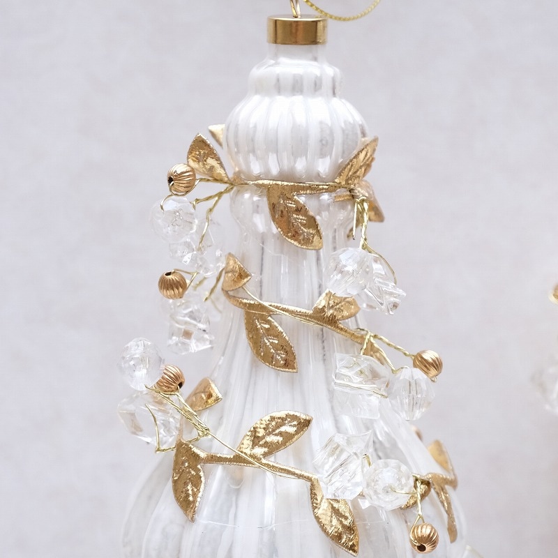 白いガラスのフィニアル型オーナメントに、リーフやビーズを装飾した華やかなツリーオーナメント。