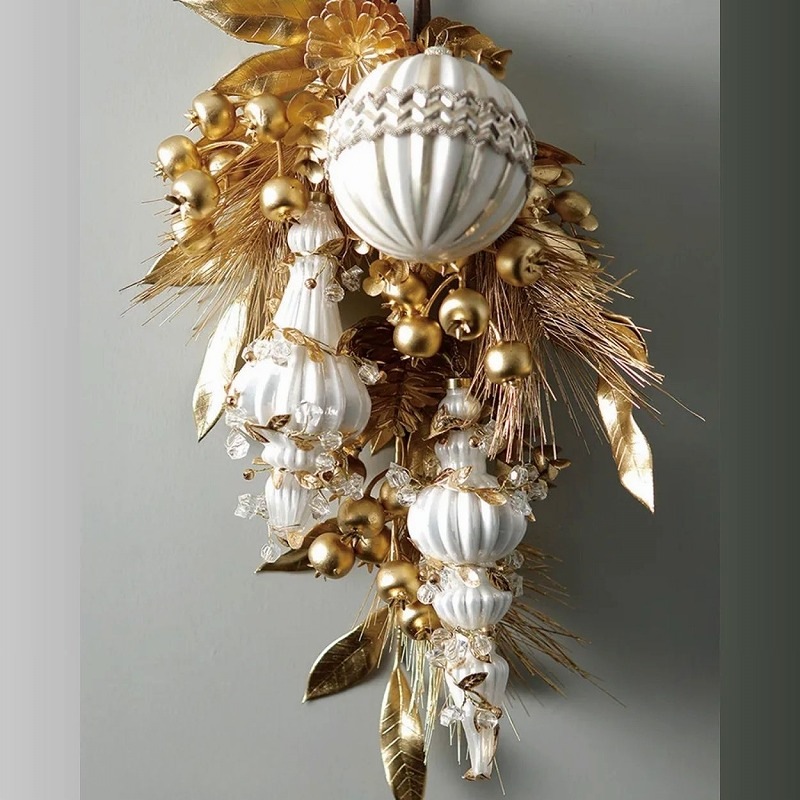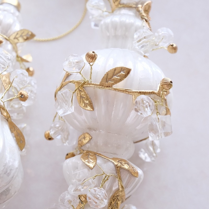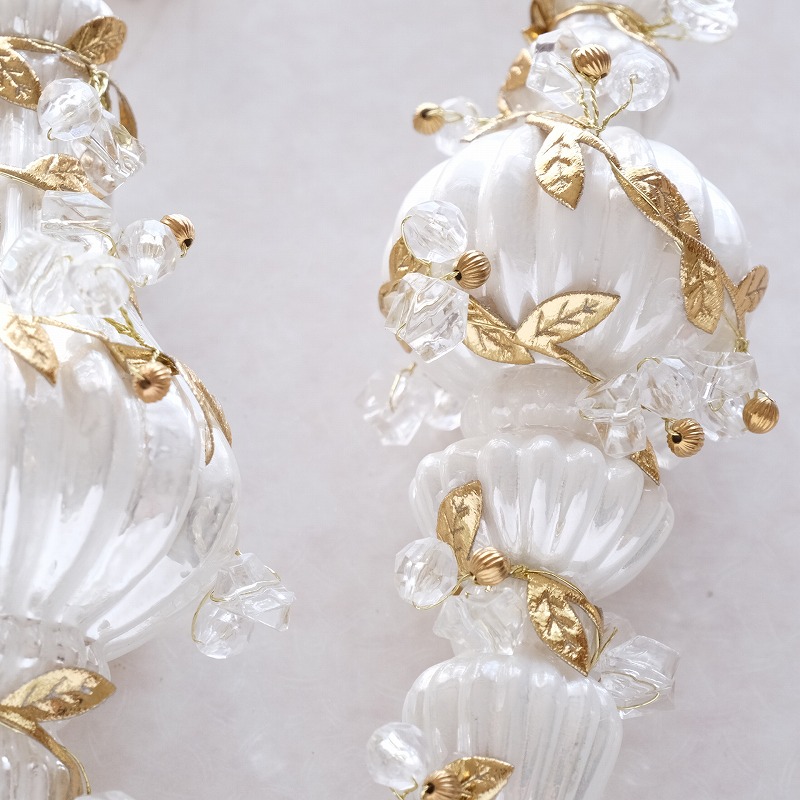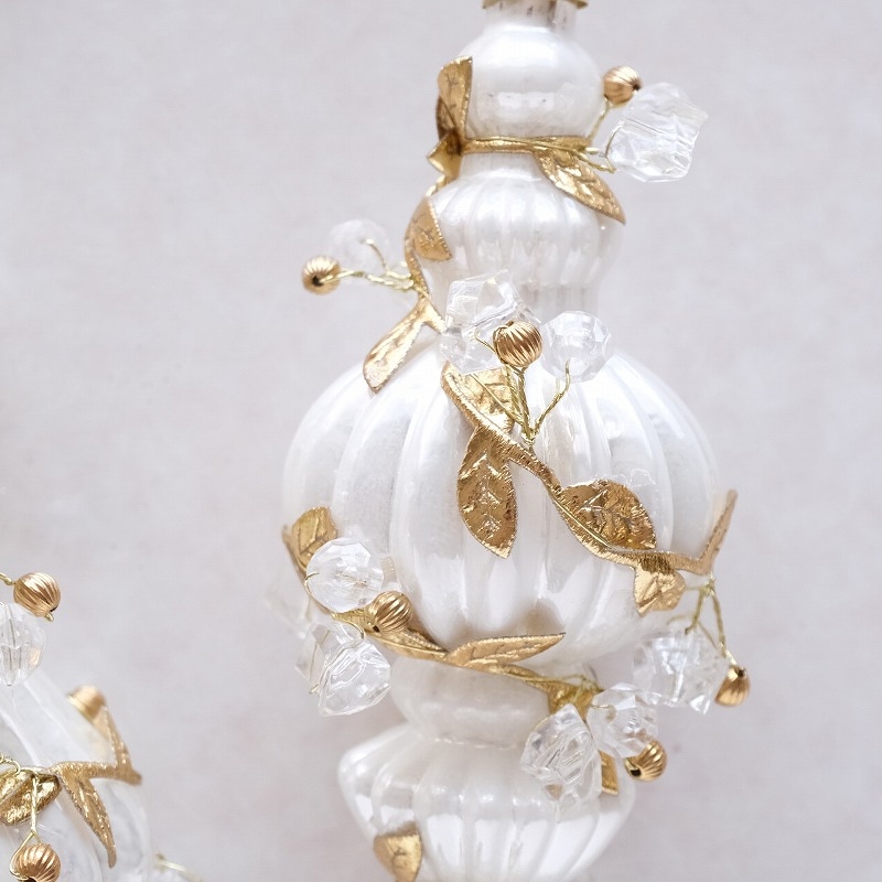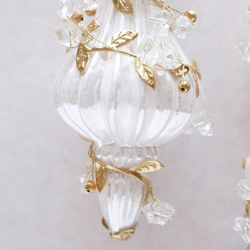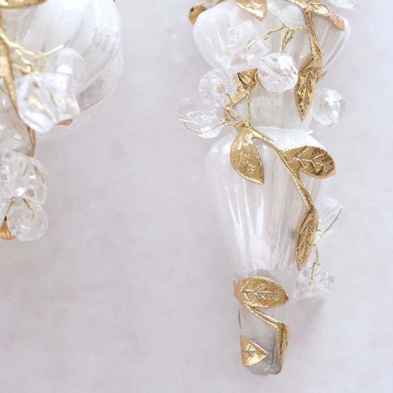 白いガラスのフィニアル型オーナメントに、リーフやビーズを装飾した華やかなツリーオーナメント。