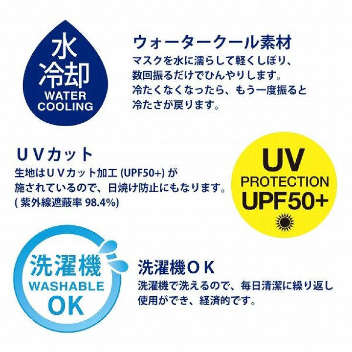 - "マスクを水に濡らして軽くしぼり、数回振るだけでひ~んやりするウォータークールマスク。