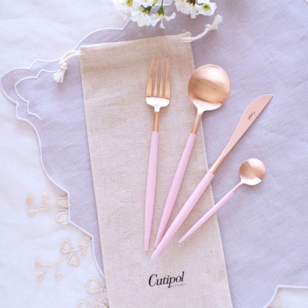 ポルトガルの人気カトラリーブランド Cutipol(クチポール)の代表シリーズ GOAシリーズ。 その中でもフェミニンで華やかな印象の ピンク×ローズゴールドカラーのカトラリーです。