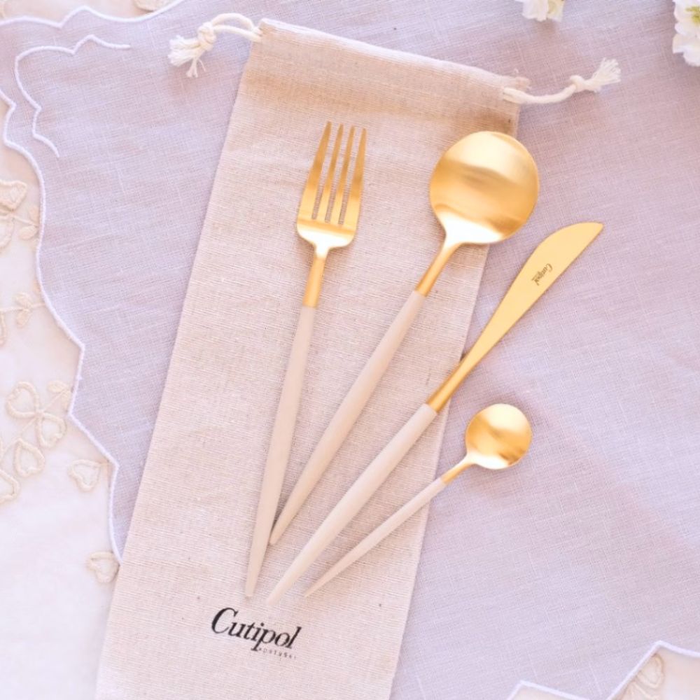 ポルトガルの人気カトラリーブランド Cutipol(クチポール)の代表シリーズ GOAシリーズ。 その中でも特にエレガントな印象を与える アイボリー×ゴールドカラーのカトラリーです。