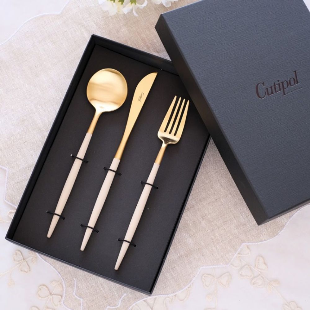 ポルトガルの人気カトラリーブランド Cutipol(クチポール)の代表シリーズ GOAシリーズ。 その中でも特にエレガントな印象を与える アイボリー×ゴールドカラーのカトラリーです。