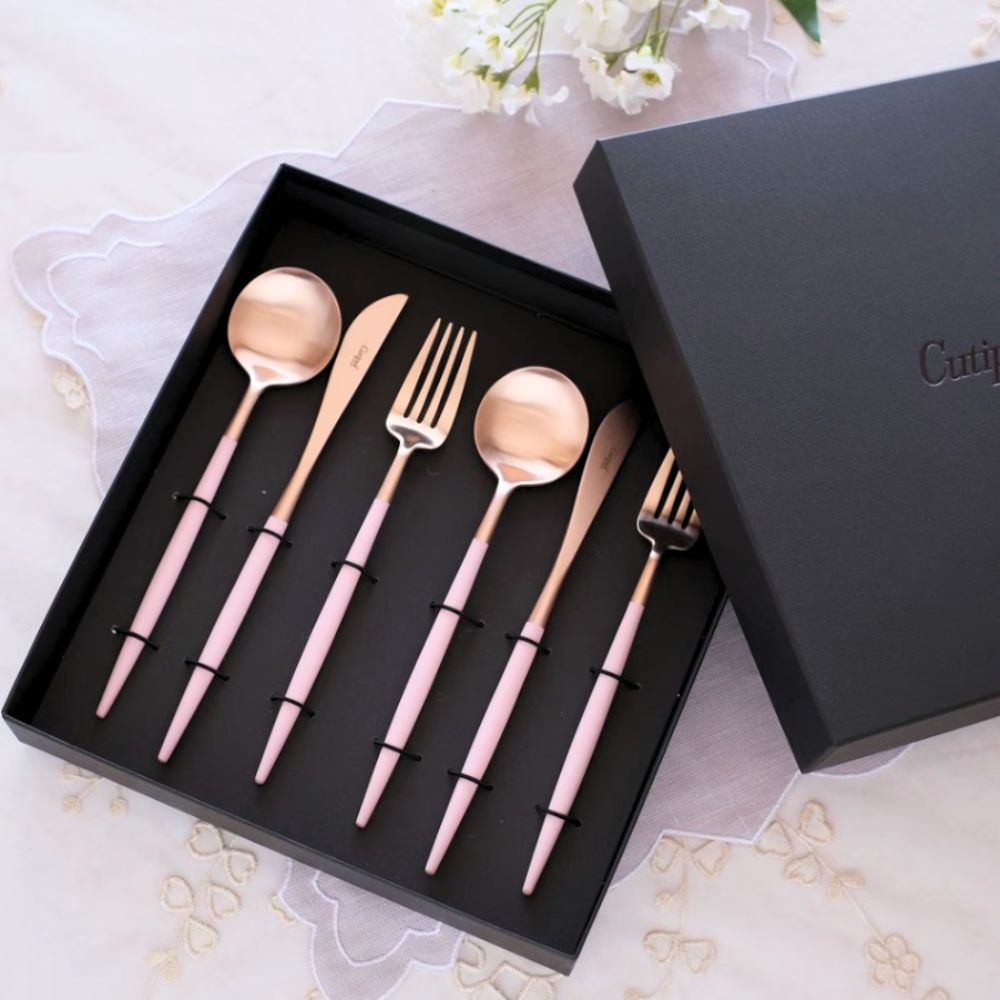 ポルトガルの人気カトラリーブランド Cutipol(クチポール)の代表シリーズ GOAシリーズ。 その中でもフェミニンで華やかな印象の ピンク×ローズゴールドカラーのカトラリーです。