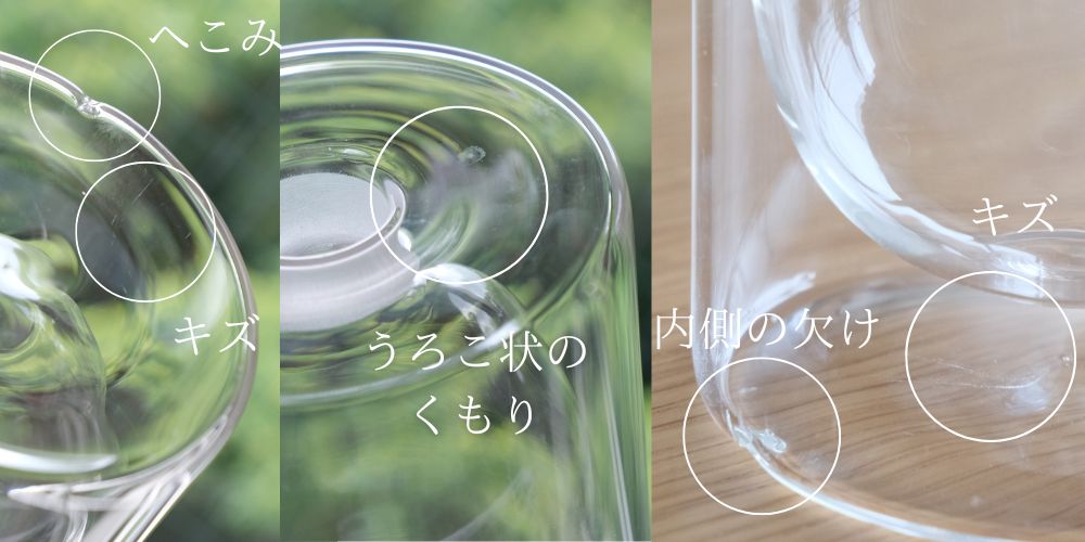 色や形、大きさ、模様が商品によって少々異なります。表面に擦れたキズ様のものやガラスの中に着色や異物混入、筋や気泡、気泡がつぶれた穴、突起ができている場合がございますが、仕様に堪えない破損の場合を除いてすべて良品とさせていただいております。また、手吹きで作られておりますので、形状に個体差もございます。歪みなどにつきましても返品交換の対象外となりますので予めご了承いただけます様お願いいたします。